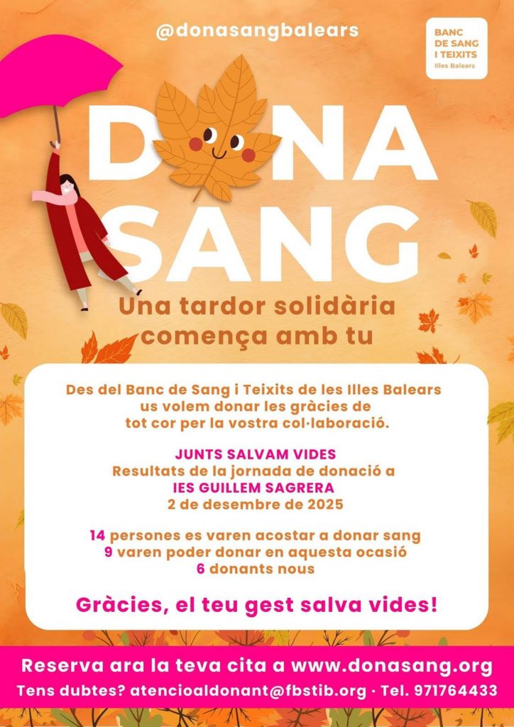 17/11/25Vols participar al projecte i apuntar-te a donar sang? Podràs fer-ho a l´institut el dimarts 2 de desembre des de les 10 a les 14 hores. Pots demanar hora en aquest enllaç :https://cita.donasang.org/ca/cita/recollida/poblacio/2424/palma/02-12-2025/